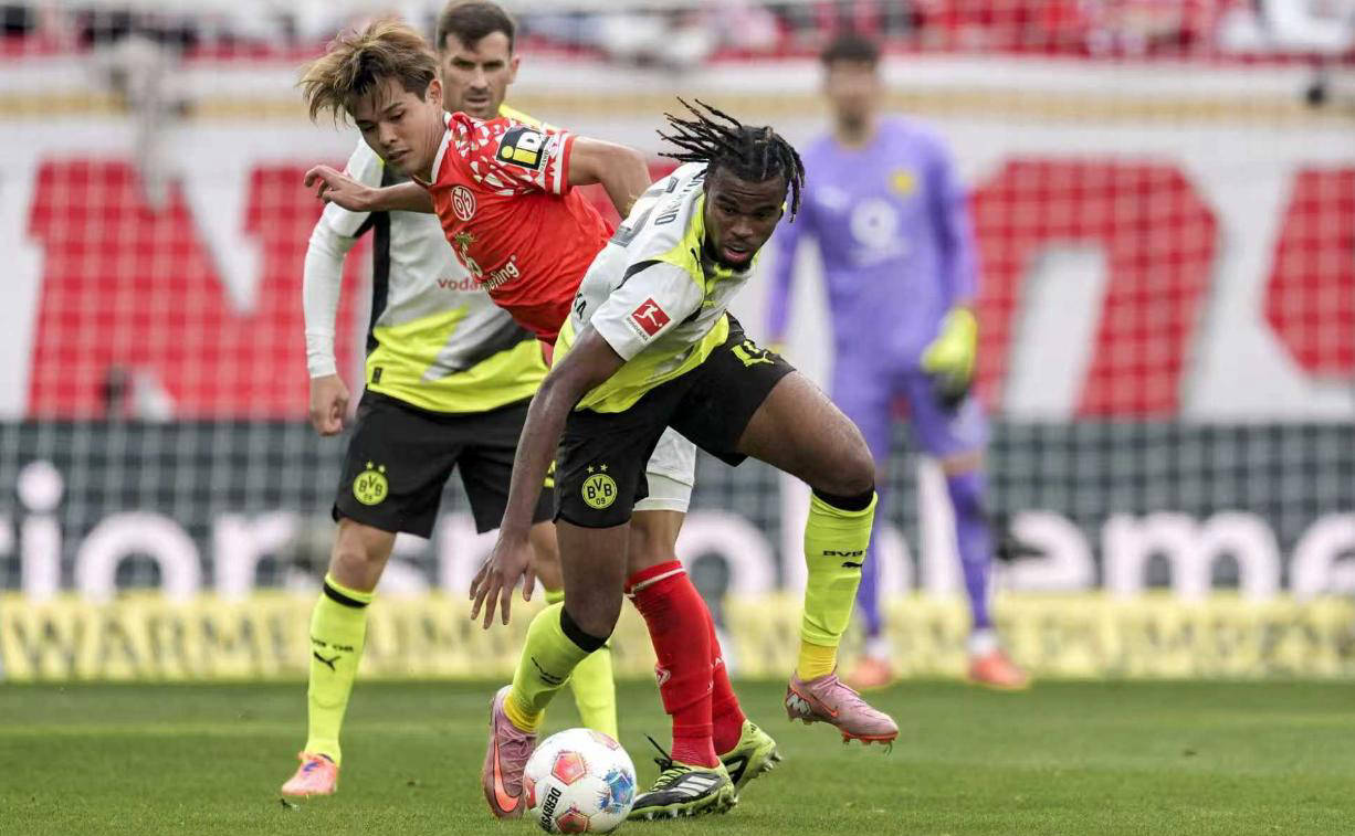 在周六的德甲比赛中,朱利安·瑞尔森和卡里姆·阿德耶米先后攻入进球,帮助多特蒙德上半场就确立了领先优势。比赛到第67分钟时,美因茨的门将罗宾·泽特纳因红牌被罚出场,使得志在追赶榜首拜仁慕尼黑的多特蒙德轻松获胜。